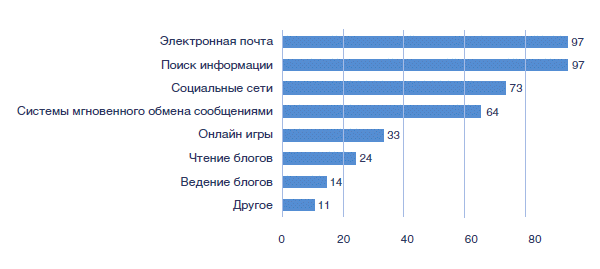 В России в течение прошлого года произошел качественный сдвиг в развитии социальных медиа. Интернет-пользователи требуют от социальных платформ все более широкого технического функционала для обмена информацией. По данным исследования, социальные сети вышли на третье место, обогнав по популярности системы мгновенного обмена сообщениями. Почти три четверти опрошенных (73%) регулярно используют Интернет, чтобы проводить время в социальных сетях.