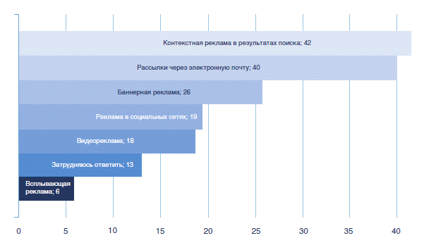Рекламу в социальных сетях готовы воспринимать почти 20% участников исследования, будь то контекстный или баннерный формат сообщений. В целом, интернет-пользователи негативно относятся к любой рекламе. По результатам исследования, лояльнее всего респонденты воспринимают рекламные сообщения в формате контекстных объявлений в результатах поиска (42%) и рассылки по электронной почте (40%). Баннерную рекламу предпочитает каждый четвертый участник опроса. Меньше всего пользователи воспринимают всплывающую рекламу.