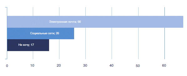 Если говорить об отношении интернет-пользователей к продвижению компаний в социальных медиа, то всего лишь 17% респондентов предпочли бы вовсе не получать информацию о специальных предложениях, скидках и новинках — ни в социальных сетях, ни в форме рассылки по электронной почте. Мужчины меньше проводят времени в социальных медиа и чуть негативнее воспринимают маркетинговые рассылки. Доля респондентов, не желающих получать информацию от компаний, среди мужчин составила 20%, а среди женщин она не превысила 15%. Из тех, кто хотел бы получать подобного рода информацию, доля респондентов, воспринимающих социальные сети как канал распространения маркетинговой информации, составила 28%.