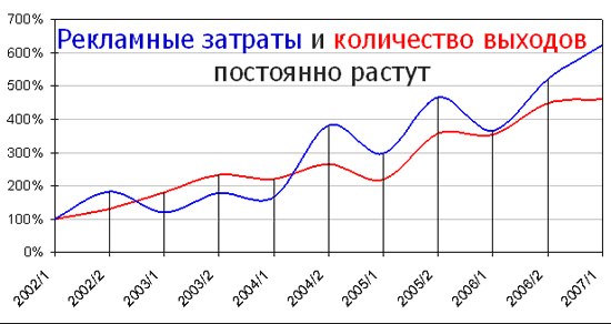В 2002–2007 годах реклама банков постоянно растет по показателям затрат и выходов. 2-е полугодие каждого года несет с собой больше рекламных затрат, чем 1-е. За 100% принято 1-е полугодие 2002 года.