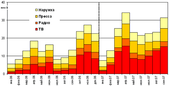 Сезонность рекламных затрат банков в январе 2006 — сентябре 2007 года по видам СМИ