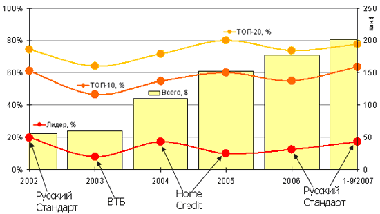 Концентрация банковской рекламы высока и продолжает повышаться. Большая часть расходов на банковскую рекламу осуществляется двадцатью крупнейшими банками-рекламодателями (80% всех рекламных затрат банков за 9 месяцев 2007 года). Лидеры рекламного продвижения меняются, но концентрация рекламных затрат со временем постоянно увеличивается. На графике обозначены лидеры рекламных затрат, их доля и абсолютные затраты на рекламу в каждом году. Видно, что доля банка-лидера по рекламным затратам достигает 20%, а доля топ-10 ведущих банков-рекламодателей достигает 60% всех затрат банков на рекламу.