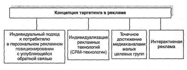 Концепция таргетинга рекламы определяет стратегию достижения рекламой малых целевых групп. Концепция таргетинга выделяет развитие отношений с потребителем и увеличение ценности рекламного сообщения для него в качестве приоритетных задач. Она рассматривает потребителя как активного и полноправного оператора рекламного рынка с долгосрочной программой собственной деятельности и углубляющейся обратной связью.
