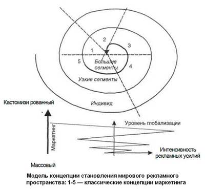 Концепция рекламного пространства раскрывается в анализе эволюции предшествующих концепций. На рисунке предложена концептуальная модель создания мирового рекламного пространства в виде диалектической спирали развития рекламной деятельности, где под радиусом-вектором спирали будем понимать уровень интенсификации рекламных усилий, а угол разворота спирали будет определять время. Каждый виток эволюционной спирали представляет собой целевую направленность рекламы во времени и в зависимости от уровня мирового развития концепций рекламы, а также роста объема мирового рекламного рынка по совместимым медиаканалам.