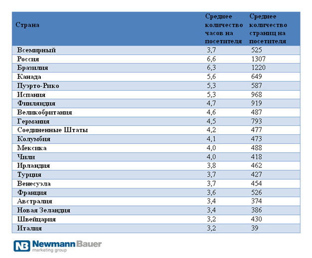 Сегодня социальные сети в мире занимают нишу самых высокодоходных сайтов в Интернете. Из 1, 1 млрд. пользователей в возрасте от 15 лет и старше по всему миру, кто имеет доступ в Интернет с домашнего или рабочего компьютера в мае 2009 года 734, 2 млн. пользователей посещали хотя бы один сайт социальной сети в течении месяца, что соответствует 65 % всех пользователей Интернета в мире. Русская аудитория пользователей социальных сетей была самой высокой по посещаемости из представленных 40 стран, сообщает ComScore. Среднее времяпрепровождение россиян в социальных сетях в день составляет 6, 6 часа, среднее количество страниц на посетителя равняется 1307. Следом по пятам идет Бразилия (6, 3 часа), за которой следуют Канада (5, 6 часа), Пуэрто-Рико (5, 3 часа) и Испания (5, 3 часа).
