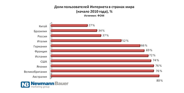 Однако существующий уровень компьютеризации и интернетизации у россиян в значительной мере отстает от ведущих стран мира. Так в Австралии число пользователей Интернета составляет 80 % от общей численности экономически активного населения. В России эти показатели держатся на отметке 37 % опережая развивающиеся экономики Бразилии (34 %) и Китая (27 %).
