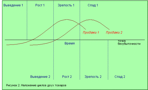 Производителю выпуск новых продуктов необходим как воздух. Взглянув на общеизвестную иллюстрацию жизненного цикла товара (рис.1.), можно видеть, что, если выпускаемый компанией товар (группа товаров) находится на этапе зрелости или умирания и у компании нет никаких новинок, которые могли бы принять эстафету "прибыли", то кризис неминуем. Производителю придется по всем канонам маркетинговой науки поддерживать "старичка" на плаву, что иной раз обходится недопустимо дорого. Если же фирма заранее побеспокоится о "смене поколений" (рис.2.), и будет это делать на регулярной основе, то на каждый "уходящий" товар будет приходиться один, а то и более, генерирующих прибыль.