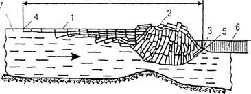 - замок или "основание" затора (5), представляющий собой покрытый трещинами ледяной покров, упершийся в кромку невскрывшегося ледостава (6), заклинивший русло реки;