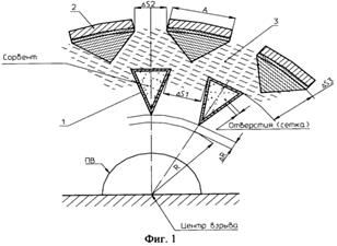 Изобретение относится к средствам защиты от воздействия взрыва и предназначено для повышения безопасности вблизи взрывоопасных объектов в аварийных ситуациях. Техническим результатом изобретения является ослабление взрывной ударной волны и поглощение вредных диспергированных частиц при взрыве и может быть использовано при транспортировании и хранении взрывоопасных объектов, содержащих взрывчатые и радиоактивные вещества. Для этого создают преграду вокруг взрывоопасного объекта. Преграду выполняют в виде двух слоев, один за другим. При этом первый слой рассекателей размещают по радиусу на пути расходящихся от эпицентра продуктов взрыва (ПВ) с содержащимися в них опасными диспергированными частицами. Второй слой размещают на пути сформированных струйных течений с зазором по отношению к первому. Преграду из второго слоя выполняют из фрагментов-поглотителей (ФП), сорбирующих опасные вещества импактированием, и с радиальным смещением ФП по отношению к рассекателям первого слоя. Зазор между слоями рассекателей и ФП заполняют пеноаэрогелеобразующей массой, взаимодействующей с газовыми потоками. При этом аэробаллистические параметры, массу, количество и размеры ФП выбирают из соотношения: