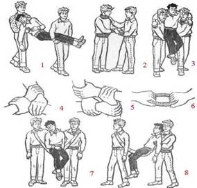 Два носильщика могут переносить пострадавшего на руках в сидячем или лежачем положении (рис.2).