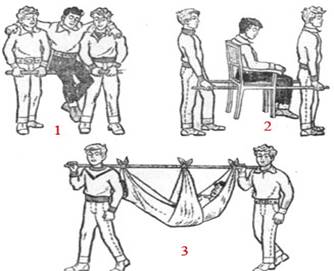Рис.3. Переноска пострадавшего двумя носильщиками с использованием подручных средств: 1 - на палке; 2 - с помощью двух палок и кресла; 3 - с помощью жерди и двух простыней.