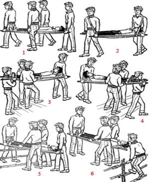Рис.5. Приемы переноски пострадавшего на носилках.