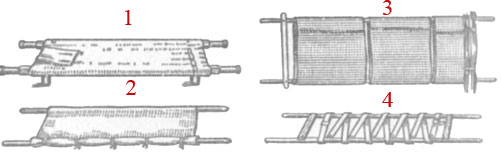 Рис.6. Носилки медицинские и их импровизации: 1 - стандартные; 2 - из двух жердей и тюфячной наволочки; 3 - из двух жердей и мешков; 4 - из двух жердей и лямок