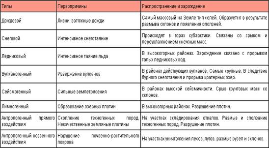 · антропогенные. Это результат хозяйственной деятельности человека. Происходят там, где наибольшая нагрузка на горный ландшафт. Образуются новые селевые бассейны.