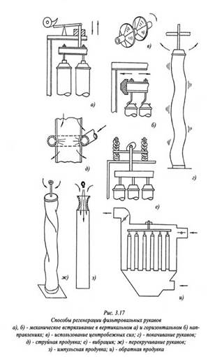 Возможность применения в каркасных фильтрах стеклотканей естественно расширяет сферу их применений в пределах, связанных с необходимостью очистки высокотемпературных газов. Эффективным методом регенерации фильтровального материала является обратная продувка очищенным газом или напорным воздухом (рис.3.17з). Обратная продувка как правило применяется в сочетании с другими способами: механическим встряхиванием, перекручиванием, вибрацией, покачиванием рукавов и др. Такие фильтры довольно эффективны, удобны в эксплуатации и обслуживании.