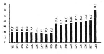 Рис. 1.5. Динаміка пожеж за причиною необережного поводження з вогнем в % від загальної кількості пожеж