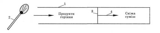 Для того, щоб отримати уявлення про поширення фронту полум’я, помістимо гомогенну горючу суміш в скляну трубку, відкриту з одного кінця (рис. 2.3), та запалимо її за допомогою зовнішнього джерела запалювання.