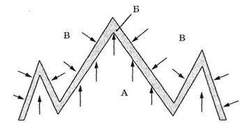 У процесі дифузійного горіння полум’я наче стоїть на місці, а в нього втікають з одного боку – горючі пари та гази (зона А), з іншого боку – повітря (зона В).