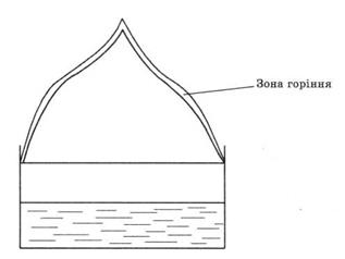 Горіння рідин відбувається у газовій фазі та являє собою складний фізико-хімічний процес, що проходить при взаємному впливі кінетичних, теплових і гідродинамічних явищ. Як результат випаровування, над поверхнею рідини утворюється паровий потік, змішування та хімічна взаємодія якого з киснем повітря забезпечує формування зони горіння, тобто тонкого шару газів, що світиться, і в який з поверхні рідини надходять горючі пари, а з повітря дифундує кисень. Стехіометрична суміш, що виникає, згоряє за частку секунди. Оскільки швидкість хімічного перетворення в зоні горіння в даному випадку залежить від швидкості надходження реагуючих компонентів до поверхні полум’я шляхом молекулярної та конвективної дифузії, процес горіння рідин називається дифузійним горінням. Спрощено горіння рідини показано на рис. 2.8.