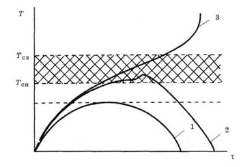 У разі помірного нагрівання матеріал без змін стану буде досягати температури середовища в термостаті, а після відключення термостата матеріал повернеться в початковий стан (крива 1). При досягненні певної температури Тсн (температура самонагрівання) в матеріалі починаються екзотермічні фізико-хімічні перетворення (розклад, окиснення тощо), і він починає самонагріватися. Залежно від умов акумуляції тепла самонагрівання може призвести або до досягнення рівноваги між тепловиділенням та теплом, що відводиться (і тоді після вичерпання здатних окиснюватися складових частин матеріалу, його температура зрівняється з температурою навколишнього середовища (крива 2)), або до досягнення певної температури Тсз (температура самозаймання, починаючи з якої здійсниться спонтанне зростання швидкості реакції та обов’язково виникне горіння (крива 3)). Зона температур між Тсн та Тсз є потенційно небезпечною.