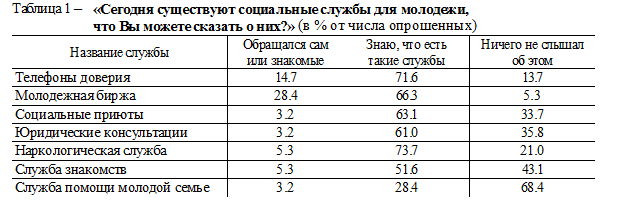 Результаты исследования показали, что молодые люди знают о существовании таких социальных служб как наркологическая (73,7%), телефон доверия (71,6%), молодежная биржа труда (66,3%), социальные приюты (63,1%), юридическая консультация (61,0%) (см. таблицу 1).
