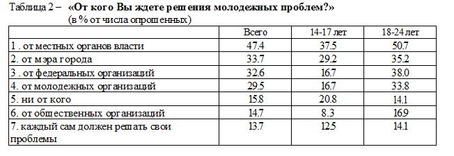 Несмотря на все «перипетии», без малого половина респондентов ожидает решения своих проблем от местных органов власти, каждый третий надеется на мэра города и чуть меньше на федеральные организации (см. таблицу 2, ответы расположены в порядке убывания). Конечно, хотелось бы, чтобы власть это доверие и ожидания молодых оправдала.