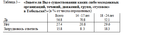 В ходе исследования обнаружилось интересное соотношение между знанием молодых людей о существовании каких-либо молодежных организаций, течений, движений и личным участием в их работе. Так, 56,8% опрошенных нами молодых людей, знают о существовании в г. Тобольске молодежных организаций, течений, движений, групп (см. таблицу 3).