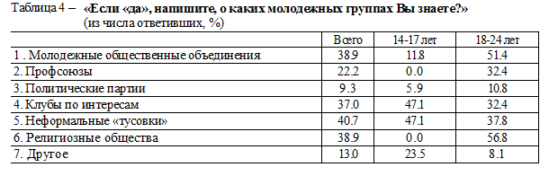 Из таблицы видно, что юные граждане более информированы в данном вопросе, среди них меньше таких кто не смог ответить на вопрос. «Осведомленность» имеет свою специфику, связана с возрастом: о молодежных общественных объединениях, например, знает каждый второй молодой человек в возрасте 18-24 лет. Только в этой возрастной группе было высказано мнение о существовании религиозных объединений (56,8%) и профсоюзов (32,4%), что может косвенно подтверждать наличие других интересов и проблем (см. таблицу 4). Кроме того, в этом возрасте в большей степени проявляется