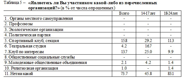 Несмотря на довольно высокий процент тех, кто не участвует ни в каких объединениях и движениях (73,7%), в целом 14-17 летние «выглядят» более «инициативными». По многим параметрам участия они «обходят» среднюю возрастную группу (18-24 года): 29,2% занимается в спортивных клубах, каждый четвертый участвует в работе клубов по интересам, несколько меньше – в театральной студии (16,7%). Заслуживает, на наш взгляд, внимания и такой факт. Больше половины 18-24 летних располагает сведениями о существовании молодежных объединений в городе, но только 1,4% является их участниками: соотношение выглядит 50:1, то есть из каждых пятидесяти «знающих» молодых людей один является участником молодежного общественного объединения. В группе 14-17 летних это соотношение составило 3:1, то есть из каждых трех «знающих» один участвует в каком-либо молодежном объединении (см. таблицу 5).