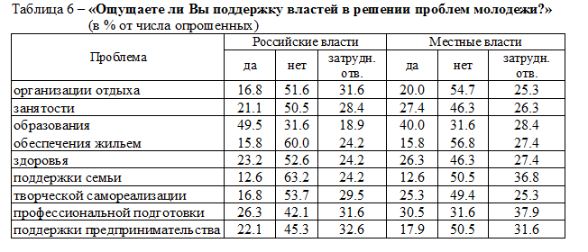Мы поинтересовались, ощущают ли молодые люди поддержку со стороны властей в решении своих проблем. Результаты опроса показали, что половина молодых людей ощущает поддержку российских властей в решении проблем образования. В решении же таких проблем, как обеспечение жильем, поддержание здоровья, содействие семье, трудоустройство, отдых молодежи -поддержка лишь «присутствует». Аналогичным образом оценивается и деятельность местных властей, хотя в целом эти значения не «дотягивают» до трети: респонденты отмечают некоторую «активность» с их стороны в решении вопросов организации отдыха и занятости молодежи, внимание к проблемам профессиональной подготовки и созданию условий для творческой самореализации (см. таблицу 6).