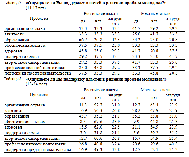 Вопросы отдыха, здоровья, творческой самореализации на этом уровне власть как-то еще пытается держать на контроле. В отсутствии стратегических программ (и осведомленности о существовании подобных) молодые люди акцентируют внимание в основном на решении сиюминутных вопросов. «Виноват» в этом, как нам кажется, не только возраст, который определяет ориентиры и кредо большинства, но и желание власти быть услышанной (см. таблицы 7, 8).