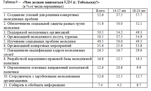 Если существуют определенные проблемы, то кто-нибудь должен заниматься их решением. Кто-то только в процессе опроса узнал, что есть в городе Комитет по делам молодежи. Собственно этот факт, на наш взгляд, породил определенные трудности и даже непонимание при ответе на вопрос «Чем должен заниматься КДМ (г. Тобольска)?». Об этом косвенно свидетельствуют результаты ответов респондентов, приведенные в таблице в порядке «значимости» (см. таблицу 9).