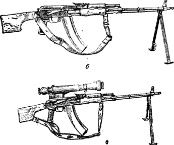 Из автомата (пулемета) ведется автоматический или одиночный огонь. Автоматический огонь является основным видом огня: он ведется короткими (до 5 выстрелов) и длинными (из автомата—до 10 выстрелов, из пулемета—до 15 выстрелов) очередями и непрерывно. Подача патронов при стрельбе производится из коробчатого магазина емкостью: у автомата—на 30 патронов, у пулемета — на 45 патронов. Магазины автомата и пулемета взаимозаменяемы.
