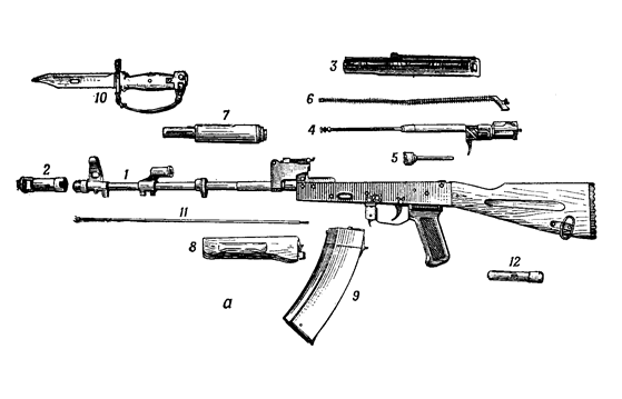 5,45-мм автомат Калашникова (рис. 1) является индивидуальным оружием, а 5,45-мм ручной пулемет Калашникова (рис. 2) является оружием стрелкового отделения. Они предназначены для уничтожения живой силы и поражения огневых средств противника. Для поражения противника в рукопашном бою к автомату присоединяется штык-нож. Для стрельбы и наблюдения в условиях естественной ночной освещенности к автоматам АК74Н, АКС74Н и пулеметам РПК74Н, РПКС74Н* присоединяется ночной стрелковый прицел универсальный (НСПУ).