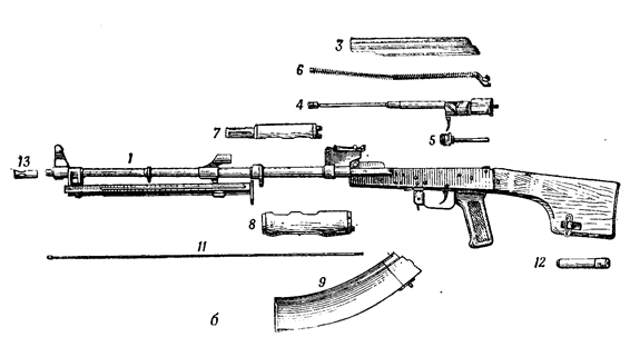 Рис. 3. Основные части и механизмы автомата (пулемёта) и его принадлежности: а- автомат, б- пулемёт; 1- ствол со ствольной коробкой, с ударно- спусковым механизмом, прицельным приспособлением, прикладом и пистолетной рукояткой, а у пулемёта и с сошкой; 2- дульный тормоз- компенсатор; 3- крышка ствольной коробки; 4- затворная рама с газовым поршнем; 5- затвор; 6- возвратный механизм; 7- газовая трубка со ствольной накладкой; 8- цевьё; 9- магазин; 10- штык- нож; 11- шомпол; 12- пенал принадлежности; 13- пламегаситель.