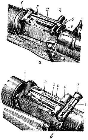 Рис. 4. Прицел: а — автомата; б — пулемета; 1 — колодка прицела; 2 — сектор; 3 — прицельная планка; 4 — хомутик; 5 — гривка прицельной планки; 6— защелка хомутика; 7— маховичок винта целика; 8 — целик.