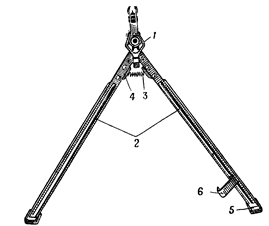 1—основание сошки; 2—ноги, 3—пружина; 4— выступ; 5 — полозок; 6 — пружинная застежка.