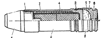 а—осколочная граната; б—пороховой заряд; в — взрыватель' 1—корпус; 2 — ведущий поясок: 3— пружина (осколочная “рубашка”); 4 — разрывной заряд; 5 — гильза; 6 — капсюль воспламенитель; 7 — нитроглицериновый порох