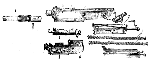 4— возвратные пружины; 5 — приемник; 6 — ударно-спусковой механизм; 7—крышка ствольной коробки с механизмом перезаряжания.