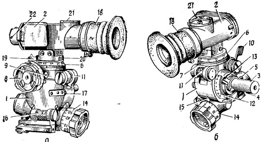 л — вид слева; б—вид справа: 1`—корпус; 2 — головка прицела: 3 — ось прицела; 4 — овальная выемка;S — штифт; 6 — угломерное кольцо; 7—указатель больших делений угломера: 8 — барабанчик угломера; »—указатель делений барабанчика угломера; 10— отводка: //—поперечный уровень; 12— шкала больших делений прицела: 13— указатель шкалы больших делений прицела; 14 — барабанчик прицела; /5 — указатель делений барабанчика прицела; 16 — продольный уровень; 17 — планка для крепления патрона подсветки; /в—наглазник; 19 — мушка; 20 — целик: