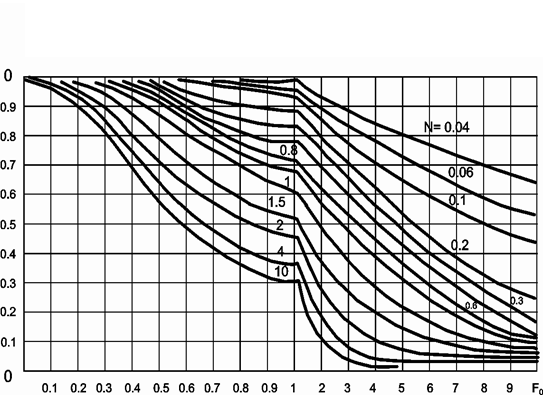8. Для рассчитанных F0 и N определяем значение безразмерного параметра Ө по рис. 3.2.