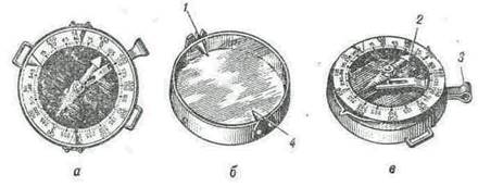 а — общий вид; б — крышка во стойками для визирования (прорезь, мушка) и указатель отсчетов; в — лимб, стрелка и тормоз, 1 — мушка, 2 — магнитная, стрелка, 3 — тормоз, 4 — прорезь