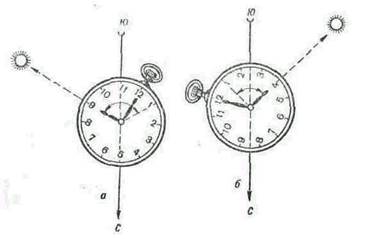 При определении сторон горизонта по Солнцу и часам (рис.2) необходимо установить часы в горизонтальное положение, чтобы часовая стрелка была направлена на Солнце. Затем, удерживая часы в этом положении, мысленно разделить угол между часовой стрелкой и цифрой пополам. Полученная прямая укажет приближенно направление на юг. До полудня надо делить пополам дугу (угол) на циферблате, которую часовая стрелка должна пройти до 13 (14) часов, а после полудня — дугу, которую она прошла после 13 (14) часов.