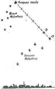отрезок прямой между двумя крайними звездами «ковша» (а и 6) мысленно продолжить в сторону расширенной его части и отложить пять раз (рис. 3). Полученная точка укажет положение Полярной звезды, которая входит в созвездие Малой Медведицы и всегда находится в направлении на север.