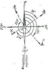 Рис. 5. Магнитные азимуты: на лиственное дерево — 56°; на фабричную трубу — 137°; на ветряную мельницу — 244°, на ель — 323°