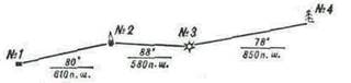 Для движения по азимутам необходимо знать магнитные азимуты с каждого пункта на маршруте движения и расстояние между пунктами движения в парах шагов (для человека среднего роста пара шагов принимается за 1,5 м). Эти данные подготавливает командир отделения (взвода) и оформляет в виде схемы маршрута движения (рис. 6) или таблицы (табл.1).