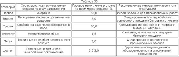 Разработка мероприятий по обезвреживанию и переработке неутилизируемых промышленных отходов привела к необходимости дополнительной классификации их по гигиеническому и технологическому принципам. Классификация по гигиеническому принципу подразделяет промышленные отходы на 6 категорий (табл. 30).