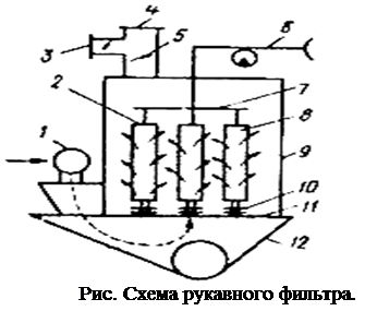 В тканевых фильтрах пылевоздушная смесь пропускается через перегородки в виде рукавов или рамок, изготовленных из тканей. Рукавный фильтр (рис.2.3.19.) представляет собой закрытый кожух 9 , в котором подвешены рукава 8 в количестве, соответствующем требуемой производительности. Нижняя часть кожуха – пылевой бункер 12 , в который через канал 1 подается запыленный воздух, имеет устройство для удаления пыли. Верхняя часть бункера герметично отделена от основания рукавов перегородкой 11 с патрубками 10 . На эти патрубки натянуты нижние концы рукавов. Верхние концы рукавов закрыты крышками 2 , укрепленными на подвеске 7 . Эта подвеска связана с ударным или встряхивающим устройством 6. Кожух фильтра через патрубок 4 связан с всасывающим вентилятором. При входе в бункер запыленный воздух теряет скорость, и в этом месте выделяется часть крупной пыли. Затем воздух поступает через патрубки в рукава. На внутренней поверхности рукавов отделяется пыль, и воздух выходит из кожуха через открытый клапан 5 . Последний для очистки фильтра перекрывают, а через клапан 3 вводится чистый воздух для продувки, и подвеска совершает резкие возвратно-поступательные движения, благодаря чему слой пыли стряхивается и падает в бункер.