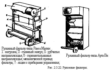 В рулонных фильтрах для очистки воздуха используют стекловолокнистые капроновые или бумажные фильтрующие материалы, изготовленные в виде полотнищ длиной 15 … 20 м.