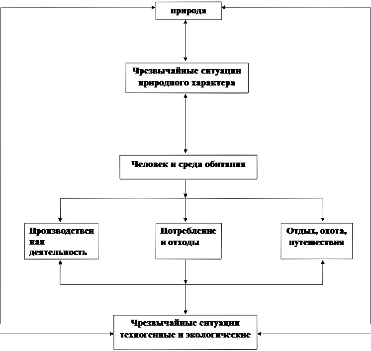 На рисунке представлена взаимосвязь человека, его жизнедеятельности и чрезвычайных ситуаций природного и техногенного характера. Изучив направление линий на данной схеме, отчетливо видно, что ЧС, от каких бы причин они не возникли, они в любом случае, отрицательно воздействуют на природу и человека.